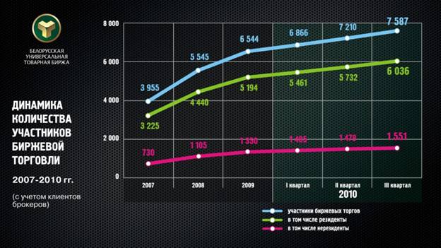 Эффективность биржевой торговли подтверждается фактом участия в торгах значительного количества иностранных компаний. На 30.09.2010 в БУТБ зарегистрировано 7587 компаний, в том числе 1551 нерезидент из 50 стран мира.
