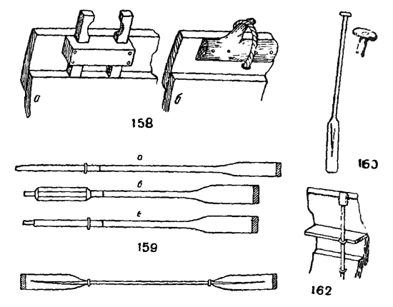Уключины. На шлюпках, у которых есть прочный привальный брус на него набиваются подуключники — колодки с дырой. В обычных речных лодках к верхней доске прибивают изнутри короткие колодки — подушки для уключин. В них делается одно или два отверстия, в которые вставляются один или два нагеля (рис. 153а). В первом типе весло имеет дужку, которая надевается на нагель, во втором весло кладется между нагелями. Настоящие уключины морских шлюпок - металлические в виде ухвата, вставляются в отверстия подключника и привального бруса; снизу они должны иметь цепочку или ремешок, прикрепленные к борту, чтобы уключина не выпадала за борт при вынимании весла. Можно заменить уключину и подушку обрезком дерева с суком, торчащим кверху. Весло без дужки можно применить и с одним нагелем - весло при этом удерживается кольцом из веревки или даже вицы (скрученная ветка), одетым на нагель или пропущенным в борт (рис. 158б). Моряки считают, что веслом с дужкой нельзя пользоваться, при нем невозможна правильная гребля, применяющаяся к обстоятельствам, и гребец может делать только однообразные примитивные удары. Но это устройство весел широко распространено на реках нашей родины, и в спокойных условиях речного плавания, а особенно для малоопытного гребца, такие весла проще и и удобнее. Для морских шлюпок безусловно необходимы настоящие металлические уключины.