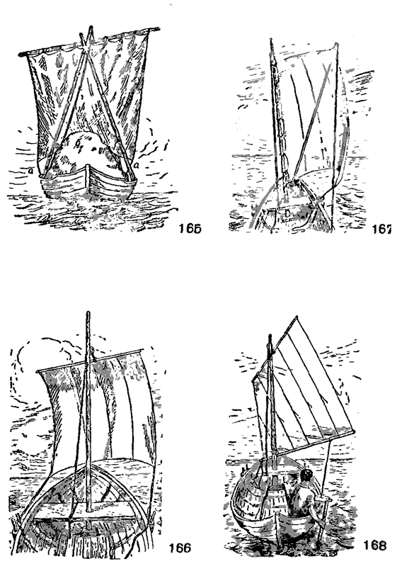 Подобная ножницеобразная мачта из двух жердей может быть установлена и для постоянного плавания, если в крытой лодке обычная мачта будет мешать проходу или если дно лотки занято большим грузом. Верхние концы двух шестов связываются вместе, к ним прикрепляется кольцо для фала и ванты, отнесенные подальше к корме; нижние концы шестов укрепляются в колодках у шпангоута за передней банкой; прямой парус прикрепляется к рейке и поднимается обычным способом (рис. 165).