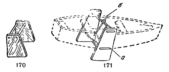Плоскодонки и лодки с овальным сечением плохо используют боковой ветер (галфвинд) и даже ветры, дующие сзади не вдоль оси лодки, так как они сильно дрейфуют в сторону. Если приходится часто итти на таких лодках под парусами, следует поставить один из типов onycкного киля. Простейший из них — шверты или шверцы; это — две доски в виде высоких трапеций, или продолговатых прямоугольников, опущенные с обоих бортов. В наиболее быстро устанавливаемом типе доски скреплены одним или двумя поперечными шестами, которые кладут поперек лодки и привязывают к банкам (рис. 170). В другом типе — доски связываются веревками — одной под дном лодки и другой над бортами; верхняя веревка закруткой закручивается до тех пор, пока шверты не прижмутся к бортам; шверты должны быть строго параллельны диаметральной плоскости лодки, и если борта выпуклы, то между швертом и бортом надо забить клинья (рис. 171). Плоскодонка с швертами может итти даже круче к ветру, чем килевая лодка. Шверты могут быть сделаны так, чтобы их можно было опускать отдельно — при боковом ветре опускается одни шверт с подветренного борта; при попутном можно не опускать швертов.