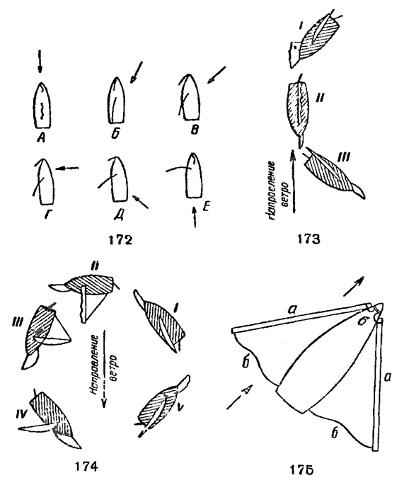 Паруса. Управление парусами требует предварительной практики, и неопытному человеку не следует пускаться в большие водные пространства на неостойчивой лодке, особенно с большой парусностью. О парусном спорте существует много специальных книг и брошюр, и мы здесь отметим только основные правила.