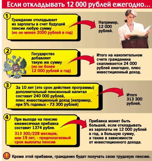 Например, если откладывать из зарплаты 12 тыс. рублей в год, а инвестиционный доход будет составлять в среднем 5% годовых, то за 10 лет, в течение которых будет действовать программа, можно сколотить дополинтельный капитал более 313 тыс. рублей (рассчеты см. в таблице справа).