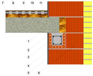 1. плита перекрытия (ППС, ПК, ПНО). 2. теплоизолирующий слой (ТехноБлок). 3. Блок профильный П-образный. 4. Каркас пространственного армирования. (стержни арматуры диаметр не менее 12мм). 5. слой штукатурки и финишной шпаклевки (ГЛИМС-GS и ГЛИМС-Гипс). 6. блок 7,3NF в том случае если толщина несущей стены 51см или блок 6,87NF если толщина несущей стены 38см. 7. слой шумоизолирующий (ТехноРуф). 8. слой технической изоляции (пергамин П300). 9. стяжка самонивелирующимися смесями ГЛИМС-S3X и ГЛИМС-SL. 10. гидроизоляционный слой. 11. напольное покрытие (например, ламинат ALLOC Норвегия). Устройство перекрытия в колодцевой кирпичной кладке