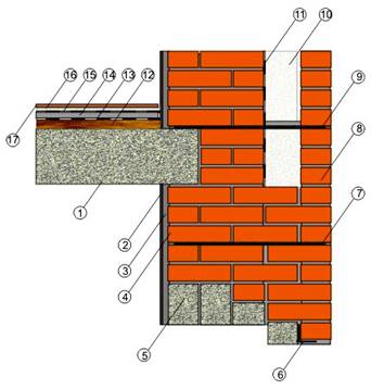 1. плита перекрытия (ППС, ПК, ПНО). 2. слой финишной шпаклевки ГЛИМС-Гипс. 3. слой штукатурки ГЛИМС-GS. 4. полнотелый строительный кирпич. 5. железобетонные перемычки. 6. стальной уголок. 7. армирующая сетка из проволоки Вр-1, диаметром 4мм. 8. лицевой кирпич. 9. армирующая сетка из проволоки Вр-1, диаметром 4мм. 10. слой теплоизоляции: 11. пенополистирол М25; минераловатная плита ТехноБлок; 12. минераловатная плита URSA П30. 13. грунтовочный слой ГЛИМС Грунт и монтажный клеевой состав ГЛИМС КФ. 14. слой шумоизолирующий (ТехноРуф). 15. слой технической изоляции (пергамин П300). 16. стяжка самонивелирующимися смесями ГЛИМС-S3X и ГЛИМС-SL. 17. гидроизоляционная пленка Ютафол 110 Стандарт. 18. слой подложки. 19. напольное покрытие: ламинат, линолеум, ковролин, керамогранит и т. п. Конструкция пола по железобетонному перекрытию Межэтажное перекрытие