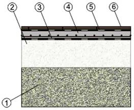 1. плита перекрытия (ППС, ПК, ПНО). 2. слой шумоизолирующий (ТехноРуф) 40-50мм. 3. слой технической изоляции (пергамин П300). 4. стяжка самонивелирующимися смесями ГЛИМС-S3X и ГЛИМС-SL. 5. гидроизоляционная пленка Ютафол 110 Стандарт. 6. напольное покрытие: ламинат, линолеум, ковролин, керамогранит и т. п. Перекрытие над холодным подпольем