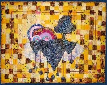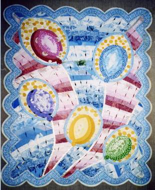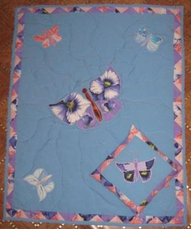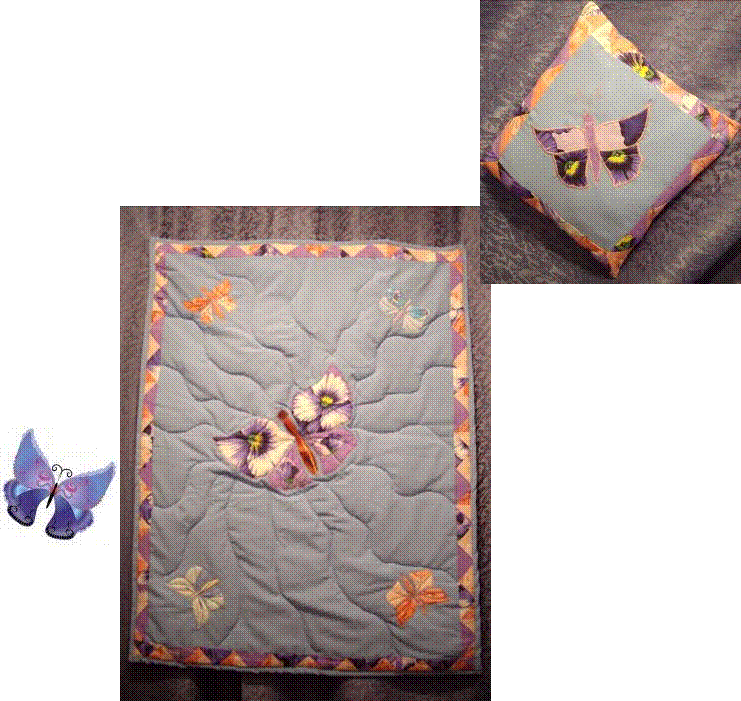 Бабочек набить синтепоном, прошить усики. Вырезать синтепон (102*129см.). Простежить прямыми смёточными стежками от центральной бабочки к углам детали одеяла.