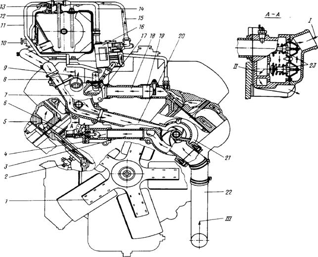 1 – вентилятор; 2 – сливной кран системы охлаждения; 3 – труба подводящая правого полу блока; 4 – патрубок подводящей трубы; 5 – головка цилиндров; 6 – выключатель гидромуфты привода вентилятора; 7 – коробка термостатов; 8 – патрубок отвода воды из бачка в водяной насос; 9 – патрубок отвода воды в отопитель; 10 – кран контроля уровня охлаждающей жидкости; 11 – труба воздухоотводящая от радиатора; 12 – бачок расширительный; 13 – пробка паро-воздушная; 14 – трубка перепускная от двигателя к расширительному бачку; 15 – трубка соединительная от компрессора к бачку; 16 – компрессор; 17 – труба водосборная правая; 18 – труба водяная соединительная; 19 – труба водосборная левая; 20 – труба перепускная термостатов; 21 – насос водяной; 22 – колено отводящего патрубка водяного трубопровода; 23 – термостат; I - в радиатор при открытых термостатах; II – в насос при закрытых термостатах; III - из радиатора.
