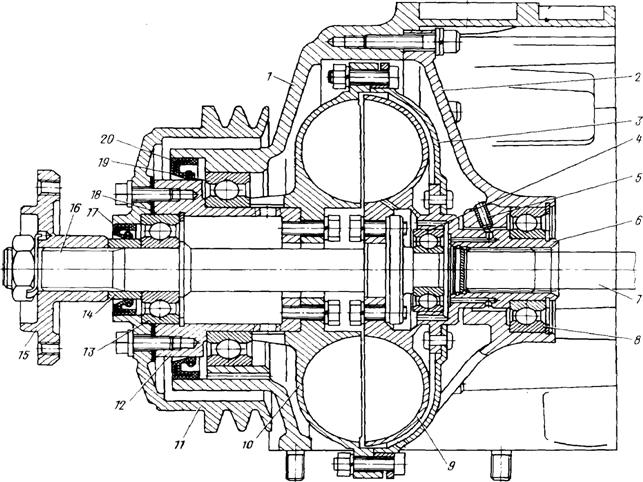 1 – передняя крышка; 2 – корпус подшипника; 3 – кожух;, 19 – шарикоподшипники; 5 – трубка корпуса подшипника; 6 – ведущий вал; 7 – вал привода гидромуфты; 9 – ведомое колесо; 10 – ведущее колесо; 11 – шкив; 12 – вал шкива; 14 – втулка манжеты; 15 – ступица вентилятора; 16 – ведомый вал; 17, 20 – манжеты с пружиной; 18 – прокладка.