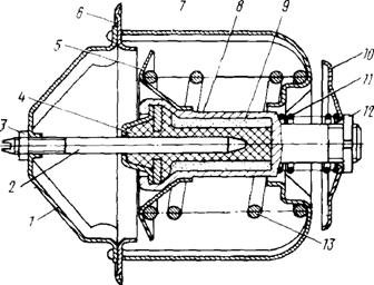 1, 7 – стойки; 2 – шток; 3, 12 – регулировочные гайки; 4 – резиновая вставка с шайбой; 6 – основание; 8 – баллон: 9 – активная масса (церезин); 11, 13 - пружины.
