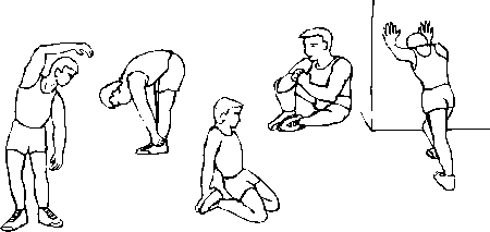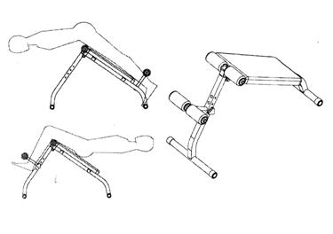 Применение тренажера. Перед началом занятий на тренажере убедитесь, что тренажер исправен. В случае обнаружения неисправностей или поломок занятия на тренажере запрещены до полного устранения неисправностей или поломок. Рекомендации для тренировок. Обязательно перед началом тренировки проведите разминку, хорошо разогрейте все мышцы. ). Результатом готовности к работе является появление легкой испарины. Перед началом работы с отягощениями определите для себя рабочий вес, который составляет 70% максимального (максимальным весом считается тот вес, который вы способны поднять только один раз без рывков и раскачиваний). Разминка подготавливает Вас к выполнению основного комплекса упражнений, разогревая и вытягивая мышцы, усиливает циркуляцию крови и повышает частоту ударов сердца, насыщая мышцы кислородом. Разминку для детей рекомендуем проводить в виде игры. Предлагаем Вам приведенный ниже (рис.2.) комплекс упражнений выполнять перед каждой тренировкой на тренажере. Каждое упражнение необходимо выполнять продолжительностью не менее 30 секунд. Если в ходе разминки вы почувствовали боль, то немедленно прекратите тренировку и обратитесь к врачу. Продолжительность тренировки на начальном уровне целесообразна 10-15 минут, оптимальная продолжительность тренировки – 20-30 мин. Комплекс упражнений выполняемых на тренажере Вы выбираете самостоятельно исходя из его возможностей. На скамье для пресса „Комби” можно выполнять упражнения для мышц пресса и спины. Подъем корпуса из нижнего положения к коленям ( это упражнение развивает прямую мышцу брюшного пресса); Гиперэкстензия - разгибание спины в тренажере ( это упражнение на развитие выпрямляющих мышц спины)( рис.3.). Также на тренажере можно выполнять упражнения с гантелями на разные группы мышц: 1) Мышцы груди; 2) Широчайшие мышцы спины; 3) Дельтовидные мышцы; 4) Двуглавые мышцы плеча; 4) Трехглавые мышцы плеча. | ||||||||||||