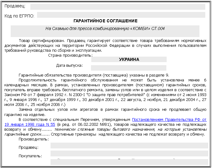 Предприятие гарантирует исправную и надежную работу тренажера при условии соблюдения потребителем требований по транспортированию, хранению и применению тренажера по прямому предназначению, при наличии штампа магазина или иной торгующей организации в гарантийном талоне. Эксплуатационный ресурс изделия без замены узлов, элементов крепления и механизмов в зависимости от индивидуального отношения и условий эксплуатации составляет 36 месяцев. В случаях, когда своевременно производится регламентное обслуживание и замена износившихся деталей, узлов и механизмов срок эксплуатации может достигать 10 лет, но не более. В случаях если тренажер подвергнут конструктивным доработкам, изменениям окраски или его формы производитель снимает с себя всякую ответственность с момента обнаружения изменений. Гарантийный срок эксплуатации вступает в силу со дня продажи. Общий гарантийный срок на изделие – 12 месяцев со дня продажи. При этом гарантийный срок на пластиковую фурнитуру и мягкие части – 6 месяцев. При отсутствии отметки в гарантийном талоне о продаже, гарантийный срок исчисляется с даты выпуска изделия указанной на упаковке. Вам может быть отказано в гарантийном ремонте если: - тренажер используется не по назначению или с нарушениями условий эксплуатации указанными в руководстве; - нарушены пломбы или сломаны одноразовые элементы, что свидетельствует о несанкционированной разборке тренажера; - превышены допустимые нормы нагрузки; - пользователем пренебрегаются требования безопасности; - пользователем произведен несанкционированный ремонт тренажера; - хранение тренажера небрежно и ненадлежащим образом; - конструкция тренажера изменена или подвергнута самостоятельной доработке; - тренажер транспортировался небрежно, что стало причиной его поломки; - нарушены требования руководства в любом из пунктов. Настоящее руководство является документом, который подтверждает соответствие основных параметров изделия требованиям ГОСТ или ТУ и признает его годным и рекомендует к применению. Примечание. Гарантийный срок на пластиковую фурнитуру и мягкие части установлен, менее общего гарантийного срока с согласия покупателя, ввиду того, что пластиковая фурнитура и мягкие части непосредственно контактируют с телом человека и могут подвергаться трудно прогнозируемому воздействию. Применение более дорогих обивочных материалов приводит к значительному увеличению стоимости изделия. Производитель готов выполнить пластиковую фурнитуру и мягкие части из более дорогих материалов с согласия клиента по его персональной заявке. В случаях, когда поломка тренажера произошла по вине производителя в рамках гарантийного срока или позже или причина поломки не выявлена, Вы вправе обратиться к производителю (поставщику, сервисную службу) за разъяснениями дальнейших действий. Адрес гарантийной мастерской: