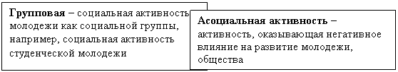 Социальная активность молодежи нами понимается как результат ее включенности в деятельность общественных объединений и организаций, выступающих как бы «социальным посредником» между социальным развитием молодежи и деятельностью молодежи, направленной на социальное развитие общества.
