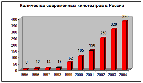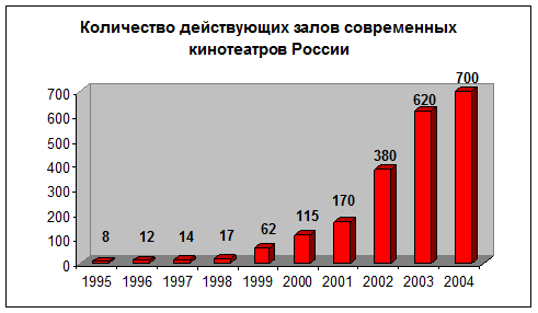 По данным Госкомстата и Министерства Культуры в 2004 году в России действовало около 12,5 тыс. сельских киноустановок и около полутора тысяч городских постоянных кинотеатров и киноустановок, из них около 450 кинотеатров (около 700 экранов) можно отнести к понятию «современный кинотеатр».