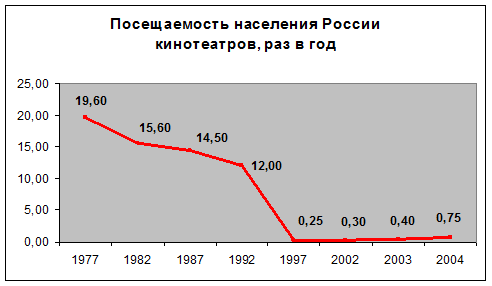 В середине 70-х годов кино в России было больше, чем просто кино. Количество посещений кинотеатров на душу населения составляло свыше 19 раз в год. Для сравнения, сейчас среднестатистический москвич ходит в кино хотя бы один раз в год, тот, кто живет далеко за пределами МКАДа, – только 0,3 раза, средний американец ходит в кино 5,5 раз в год.