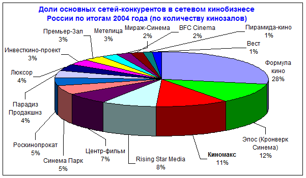 Что касается анализа отдельно кинотеатров в качестве конкурентов, то по данным исследовательского агентства «РОМИР Мониторинг» двадцатка наиболее крупных кинотеатров России на осень 2004 года выглядит следующим образом: