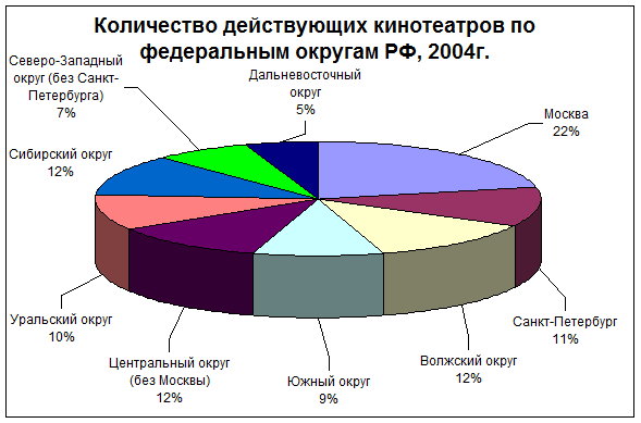 На долю одной Москвы приходится 22% количественного объема рынка кинотеатров России. Наименьшая доля рынка приходится на Северо-Западный (7%) и Дальневосточный (5%) округа: