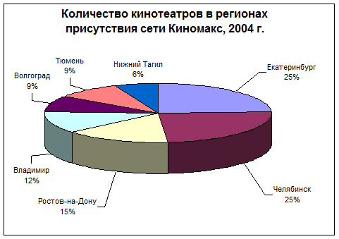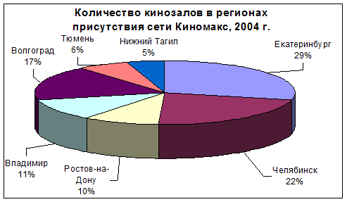 Исходя из оборота кассовых сборов на долю Москвы приходится 89 млн. долларов или 33% рынка, на Санкт-Петербург – 19 млн. долларов или 7% рынка. Остальное, т. е. около 60% рынка, сосредоточено уже сейчас в регионах России.