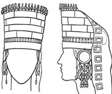 Скифский калаф – цилиндрический спереди головной убор, сбоку имел дугообразный край (подобно кокошнику), с мягким закрытым верхом и затылком. Его высота составляла 10-16 см. Передняя часть украшалась рядами золотых пластинок, а сзади набрасывалось покрывало с золотыми бляшками.