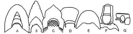 Кокошники, слева направо: A — двурогий кокошник Арзамасского уезда Нижегородской губернии; B — однорогий кокошник, Костромская губерния; C — кокошник; D — кокошник, Московская губерния, Е — кокошник, Владимирская губерния, F — кокошник в виде цилиндрической шапки с плоским дном (с платком) G — Двухгребенчатый, или седлообразный, кокошник (вид в профиль)