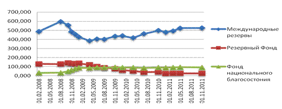 Рис. 4. Темпы изменения международных резервов, резервного фонда и фонда национального благосостояния в период с гг. (млрд. долл. США) [3]
