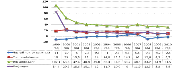 Рис. 8. Чистый приток капитала, торговый баланс, внешний долг, в % к ВВП и инфляция[9]