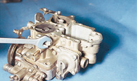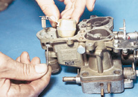 | 19. После сборки регулировку уровня топлива в поплавковой камере удобно осуществить, используя штангенциркуль. Как только его заплечики упрутся в верхнюю плоскость корпуса карбюратора, хвостовик, выставленный на глубину 21,5 мм, должен коснуться топлива. Эта операция выполняется на автомобиле после стабилизации уровня. Для подкачки топлива используем ручной привод бензонасоса. Одновременно проверяем герметичность клапана.