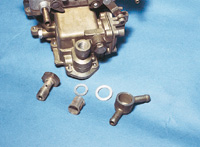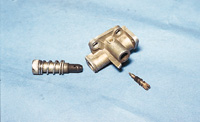 | 33. Выворачиваем регулировочную иглу жиклера дренажного канала ускорительного насоса (на снимке справа) и ограничитель хода всасывающего шарикового клапана (не потеряйте расположенный под ним шарик!).