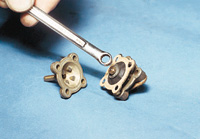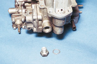 16. Чтобы топливо не подтекало через резьбу пробки оси поплавка, алюминиевую уплотнительную шайбу оси нужно обязательно вынуть из корпуса и впоследствии ставить на место одновременно с осью, обеспечив тем самым ее правильное положение в отверстии.