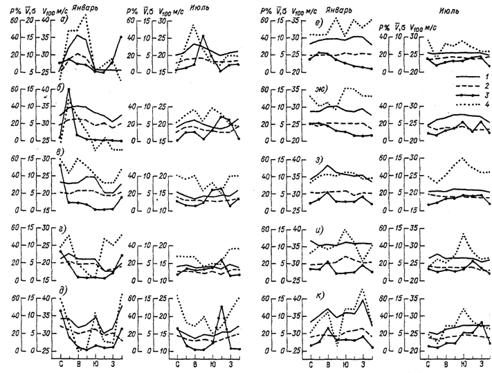а — Анадырь; б — Апука; в — Корф; г — Оссора; д — Мыс Африка; е — север восточного свала глубин; ж — центральная часть восточного свала; з — центральная глубоководная часть; ы — камчатский тихоокеанский район; к — район Алеутских островов. 1 — средняя скорость V;2 — среднее квадратическое отклонение о; 3 — повторяемость направлений Р; 4 — скорость, возможная 1 раз в 100 лет ,V 100