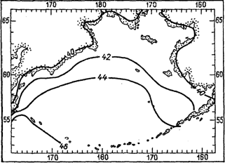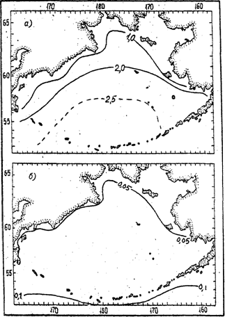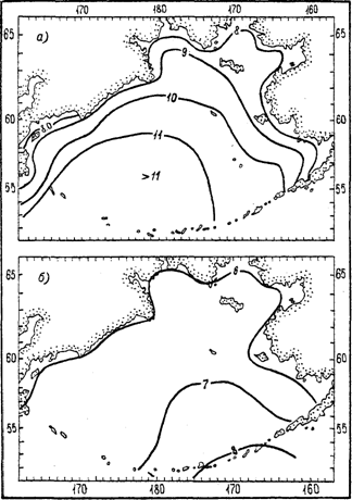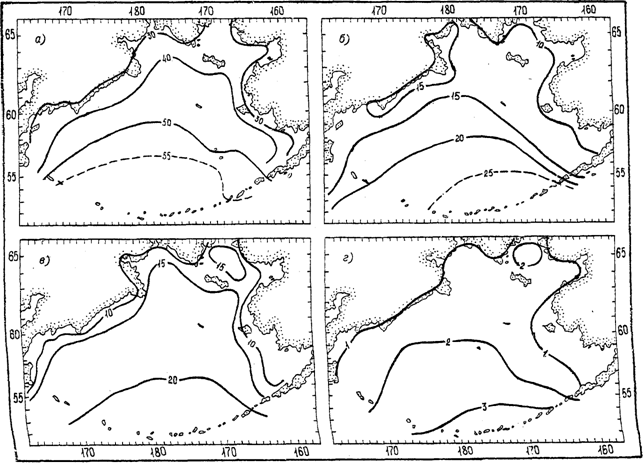 Повторяемость штормов в это время года не превышает 1—3 %, а ураганных ветров скоростью ³ 30 м/с — 0,05 %.Как видно на приводимых схемах, зоны наибольшей повторяемости штормовых ветров, охватывая всю глубоководную часть моря, тяготеют тем не менее к ее южной части. Такое распределение является следствием активного циклогенеза, развивающегося на арктическом и полярном фронтах, дислоцирующихся в области, которая в статистическом смысле составляет алеутскую депрессию.