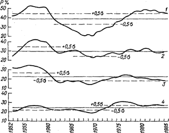 Рис. 11.8. Повторяемость Р штормов (V> 15м/с) за холодный период с осреднением по скользящим пятилеткам.1 — центральная глубоководная часть; 2 — север восточного свала глубин; 3 — западная глубоководная часть; 4 — юг восточного свала глубин.