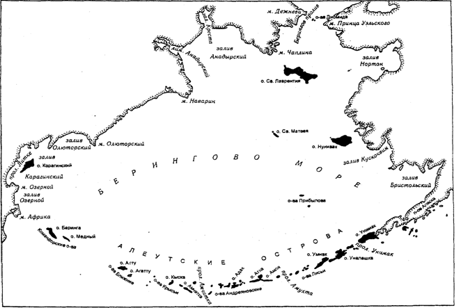 Берингово море — окраинное. Оно расположено в северной части Тихого океана и разделяет Азиатский и Северо-Американский континенты. На северо-западе его ограничивают побережья Северной Камчатки, Корякского нагорья и Чукотки; на северо-востоке — побережье Западной Аляски. Южная граница моря проводится по цепи Командорских и Алеутских островов, образующих гигантскую выгнутую к югу дугу и отделяющих его от открытых акваторий Тихого океана (рис. 1.1). Беринговым проливом на севере оно соединяется с Северным Ледовитым океаном и многочисленными проливами в цепи Командорско-Алеутской гряды на юге — с Тихим океаном.