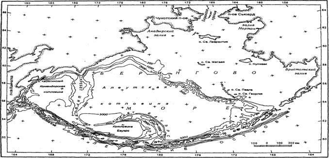 Берингово море — глубоководное (рис. 2.1). Самая глубокая его часть находится в Камчатском проливе — 4420 м, но в основном глубины менее 4000 м.