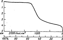 На батиграфической кривой (рис. 2.2) и в табл. 2.1 показано распределение площадей по батиметрическим ступеням. Из них следует преобладание двух основных батиметрических уровней, соответствующих верхнему шельфу и днищам абиссальных котловин.