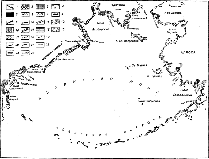 Рис. 3.1. Морфогенетические типы берегов Берингова моря с элементами динамики (по [3, 7]). Берега, мало измененные морем: 1 — фиордовые, 2 — лиманные, 3 — эстуарного типа, 4 — дельтовые, 5 — вулканические; берега, измененные морем: 6 — типично абразионные, сложенные коренными породами, 7 — абразионно-денудапионные, 8 — типично абразионные, сложенные рыхлыми четвертичными толщами, 9 — абразионно-солифлюкционвые, 10 — термоабразионные, 11 — абразионно-лагунвые, 12 — лагунно-лиманвые, 13 — берега с отчлененными лиманами, 14 — берега с отчлененными фиордами, 15 — лагунные, 1в — берега аллювиально-морских равнин, 17 — лайденаые, 18 — берега азовского типа, 19 — абразионно-бухтовые, 20 — участки замедленного роста или размыва аккумулятивных форм, 21 — участки аккумуляции наносов и роста аккумулятивных форм; направления потоков наносов: 22 — получающих питание за счет абразии и твердого стока рек, 23 — только со дна, 24 — комбинированного питания.