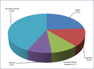 Как видно из приведенной ниже диаграммы, в структуре предложений коммерческой недвижимости на продажу во Владимирской области, в декабре 2012 года, преобладали земельные участки и объекты офисного назначения; объектов торгового и производственно – складского назначения было гораздо меньше, чем офисов. Объекты иного свободного назначения были представлены зданиями, квартирами под нежилое использование и т. п.