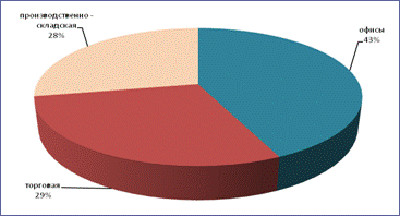 В общем объеме предложений коммерческой недвижимости в аренду также преобладали объекты офисного назначения, доли объектов торгового и производственно – складского и назначения были примерно одинаковы (29% и 28% соответственно).