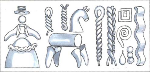 Рассмотри внимательно форму игрушек. Она монолитна, а силуэт фигурок отличается мягкой плавностью и округлостью. Как много здесь лепных деталей: изящных оборок, воланов, косичек, жгутиков! Они делают фигурки более выразительными. Игрушку составляют из отдельных частей, соединяя их в определенной последовательности, как это показано на рисунке.