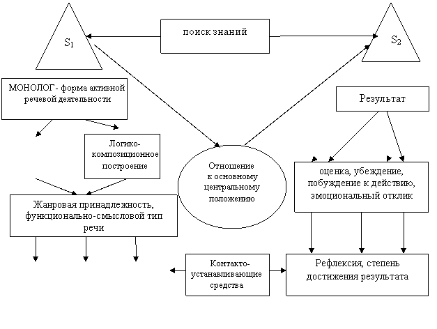 Монолог, будучи сложным видом устной речевой деятельности, представляет собой не только информационный процесс, при котором говорящий передает какое-то сообщение слушателям, но и процесс воздействия. Монолог рассматривается в работе как интерперсональный речевой акт (см. рис. 1). Монолог – это коммуникативная модель, соединяющая субъектов (говорящего и слушателей) вокруг некоторой концепции, задачи. Активную позицию в процессе монологического общения занимает один субъект. Говорящий (S1) и слушатели (S2) по-разному относятся к центральному положению, относительно которого строится аргументация. При произнесении монологического высказывания говорящий показывает свое отношение к основному центральному положению, излагаемому им перед определенной аудиторией. Результат монологического общения напрямую зависит от того, как говорящему удается передать слушателям собственное видение поставленной проблемы.