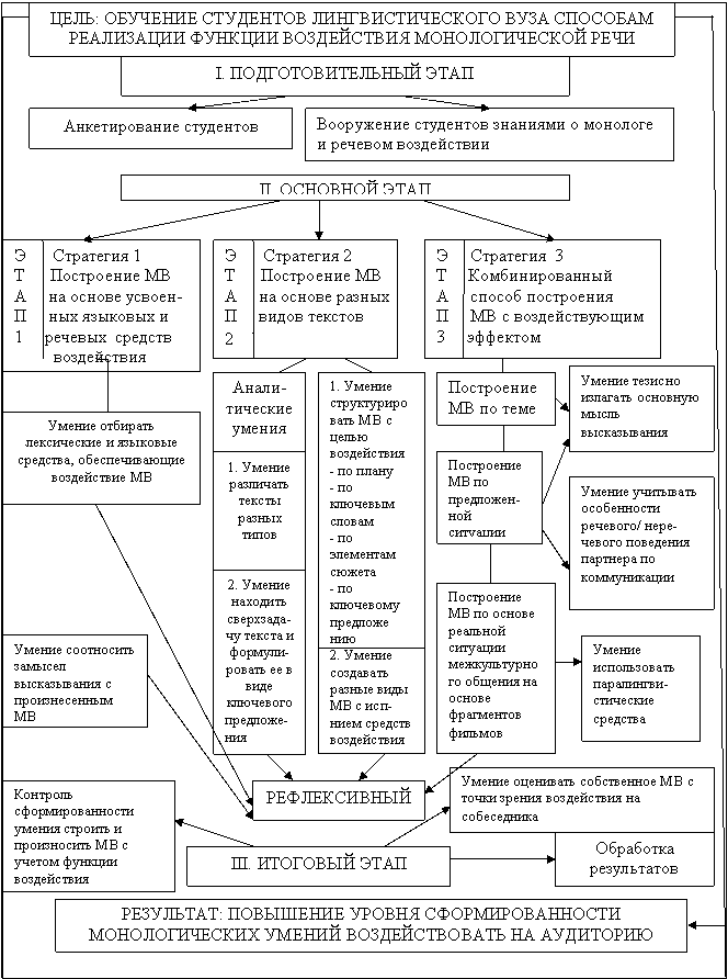 На первом этапе ( гг.) было выявлено современное состояние проблемы обучения способам реализации функции воздействия монологической речи, изучены особенности трактовки понятия речевого воздействия в различных областях науки, его применение в обучении, разработан научный и терминологический аппарат исследования, определены цель и гипотеза исследования.