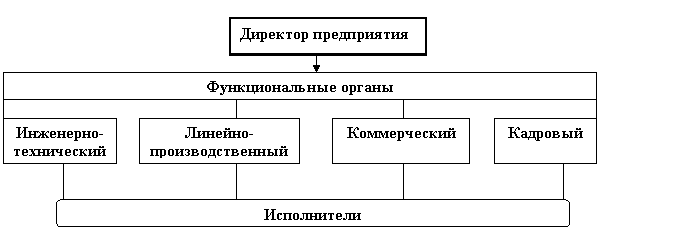 Функциональное управление (рисунок 14) состоит в том, что руководитель предприятия передает часть своих полномочий функциональным заместителям или руководителям функциональных отделов. Например, главный инженер, будучи заместителем директора, по инженерно-техническим вопросам, от своего имени издает распоряжения по всей тематике, связанной с проектированием и освоением новой продукции, техническим перевооружением производства и др., не спрашивая особого разрешения у директора. Такие полномочия могут передаваться не только директором своему заместителю, но и заместителем своим подчиненным – руководителям отделов и цехов. В таком случае исполнители получают задания не непосредственно от директора предприятия, а от руководителей функциональных подразделений или от заместителя директора. Функциональное управление позволяет рассредоточить административно-управленческую работу и поручать ее наиболее квалифицированным кадрам. Вместе с тем использование подобной структуры приводит к необходимости сложных согласованных между управленческими органами решений при подготовке почти каждого документа, которому придается большое значение. Это снижает оперативность работы, удлиняет сроки прохождения документации и сроки принятия решений. Кроме того, нередко отмечаются противоречия в формулировках и неоднозначность подхода к выполнению отдельных заданий, несоответствие содержания одних распоряжений другим. Однако на крупных предприятиях отказаться от применения функциональной формы управления невозможно.
