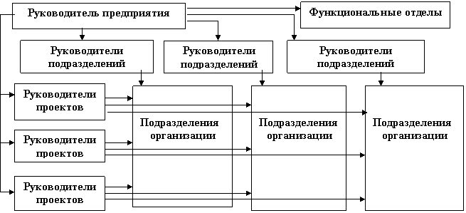 Матричная структура (рисунок 15) построена на принципе двойного подчинения исполнителей: непосредственному руководителю функционального подразделения (он предоставляет персонал и другие ресурсы руководителю проекта) и руководителю временной группы (он наделен полномочиями и несет ответственность за сроки, качество и ресурсы). Руководитель проекта взаимодействует с двумя группами подчиненных: членами проектных групп и другими работниками функциональных подразделений. Руководителю проекта они подчиняются временно и по ограниченному кругу вопросов. Они подчинены непосредственно руководителям своих отделов и служб. Переход к матричной структуре охватывает не всю организацию, а лишь ее часть.