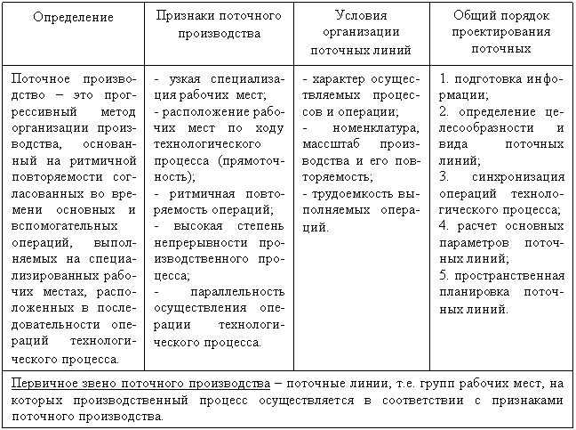 Поточное производство — форма организации производства, основанная на ритмичной повторяемости времени выполнения основных и вспомогательных операций на специализированных рабочих местах, расположенных по ходу протекания технологического процесса. (Табл.1).