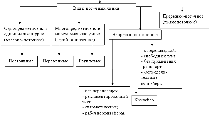 - многопредметными, когда на линии изготовляется несколько различных изделий (деталей). Последние, в свою очередь, подразделяются на переменно-поточные и групповые поточные линии.