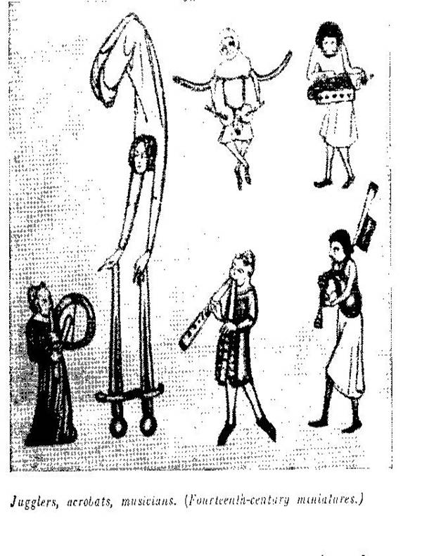 Жонглёры, акробаты, музыканты (миниатюра 14 века)