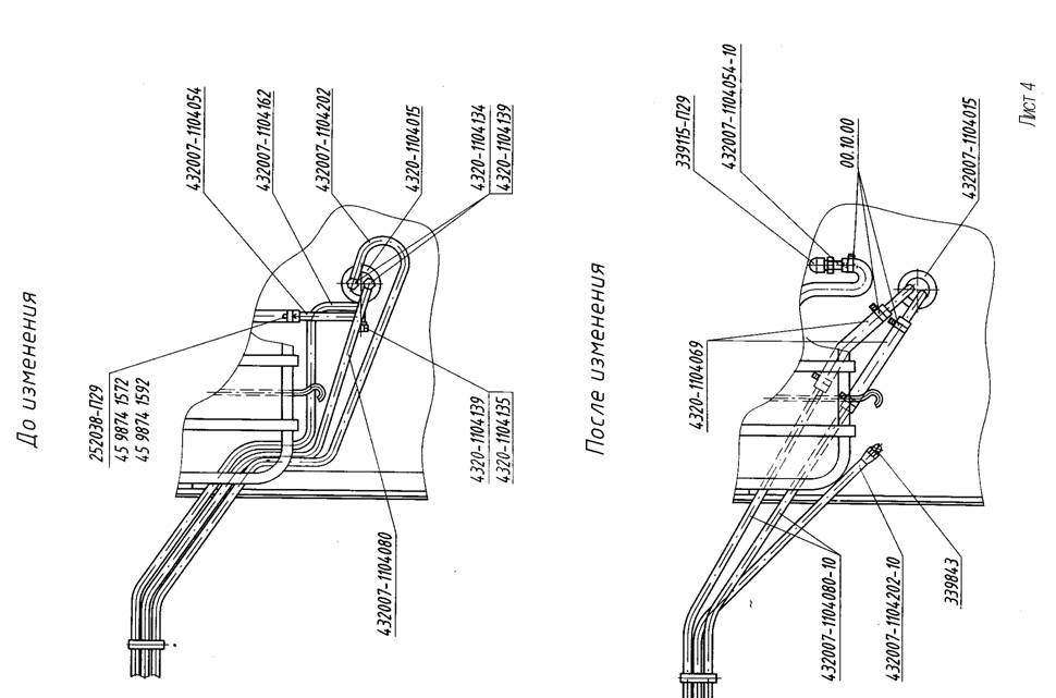4, 5, уплотнительные прокладки 9, топливные трубопроводы 054, 080,162, 202 и заменяются: на приемную трубку со штампованным фланцем 015, на два топливных трубопровода 080-10, трубку 054-10, трубку 202-10, на топливном баке пробка 262542-П29 заменяется угольником 339115-П29 и соединения топливопроводов производится шлангами 9 (рукав 10х17,5-1,47 ГОСТ, L=210 мм) при этом взаимозаменяемость в комплекте сохраняется см. эскизы графики до и после изменения.