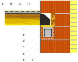 Монтаж балок ведут маячным способом, первоначально устанавливают две крайние балки, тщательно выверяя правильность установки уровнем и ватерпасом, затем ведут укладку промежуточных балок используя рейку для достижения плоскостности. Единой плоскости добиваются подкладыванием под балки антисепртированных обрезков досок разной толщины, не допускается использование щепок. 1. деревянная балка перекрытия (пиломатериал хвойных пород) 2. деревянный короб 3. теплоизолирующий слой (ТехноБлок) 4. Блок профильный П-образный 5. Каркас пространственного армирования. (стержни арматуры диаметр не менее 12мм) 6. слой штукатурки и финишной шпаклевки (ГЛИМС-GS и ГЛИМС-Гипс) 7. блок 7,3NF в том случае если толщина несущей стены 51см или блок 6,87NF если толщина несущей стены 38см 8. два слоя плиты ЦСП, по 10мм 9. стяжка самонивелирующимися смесями ГЛИМС-S3X и ГЛИМС-SL 10. клеевой слой 11. напольное покрытие (например, линолеум или ковролин) Конструкция деревянного перекрытия первого этажа