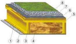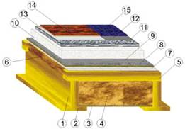1. несущий брус перекрытия 50х150мм 2. доска подшивки пола 25х150 мм 3. лист подшивки чернового пола плита OSB 3 9мм или плита ЦСП 10мм 4. теплоизоляционные маты толщиной 150мм 5. брусок обрешетки 50х50мм 6. минераловатный теплоизоляционный мат толщиной 150мм 7. слой пароизоляции Ютафол Н110 Стандарт, с проклеенными нахлестами двусторонней самоклеющей лентой Ютафол СП 8. основание пола, в качестве которого можно использовать плиты ЦСП 10мм, уложенные в два слоя, второй слой укладывается с перекрытием стыков между листами первого слоя 9. монтажный клей ГЛИМС-КФ, нанесенный методом флокинга 10. теплоизоляционная пенополистирольная плита марки М35 или плита экструдированного пенополистирола, толщиной 40-50мм 11. стяжка выполненная самонивелирующейся наливной смесью ГЛИМС-SL, толщиной 20мм 12. плиточный клей 13. слой гидроизоляционной пленки 14. ламинированное напольное покрытие 15. керамическая плитка и керамогранит Конструкция деревянного межэтажного перекрытия