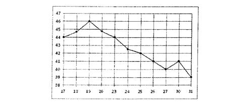 10. а) На рисунке жирными точками показана цена нефти на момент закрытия биржевых торгов во все рабочие дни с 17 по 31 августа 2004 года. По горизонтали указываются числа месяца, по вертикали – цена барреля нефти в долларах США. Для наглядности жирные точки на рисунке соединены линией. Определите по рисунку разность между наибольшей и наименьшей ценой нефти на момент закрытия торгов в указанный период (в долларах США за баррель).