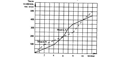 б) Фирма «Связь» выпустила в продажу две новые модели телефонов – модель А и модель В. На графиках показано, как эти модели продавались в течение года. (По горизонтальной оси откладывается время, прошедшее с начала продаж – в месяцах, а по вертикальной – число телефонов, проданных за это время – в тыс. шт.). На сколько телефонов модели А было продано больше, чем телефонов модели В за первые 8 месяцев года? Ответ дайте в тыс. штук.